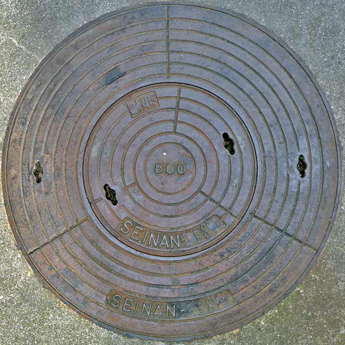 φ600くらいの大蓋。矢羽根を逆にしたようなマークは、少なくとも東京タツノとタツノ・メカトロニクスで使われていました。龍野製作所時代のものは未確認ですが、建物の年代的に東京タツノ時代の蓋と思われます。
