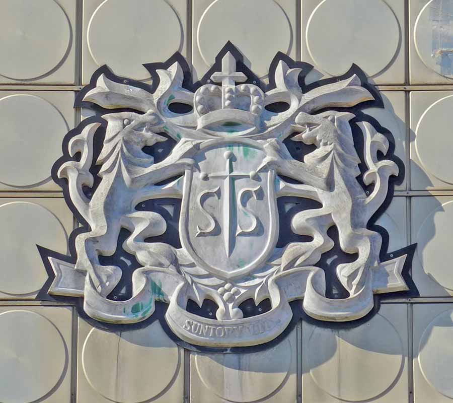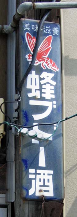 酒屋さんにあった看板です。もともと社章だったという向獅子マークは、昭和4年(1929年)には見られるとのこと。本当の向獅子マークは獅子ですが、この看板は山犬ふう。