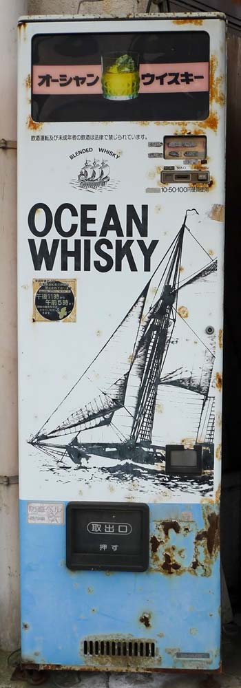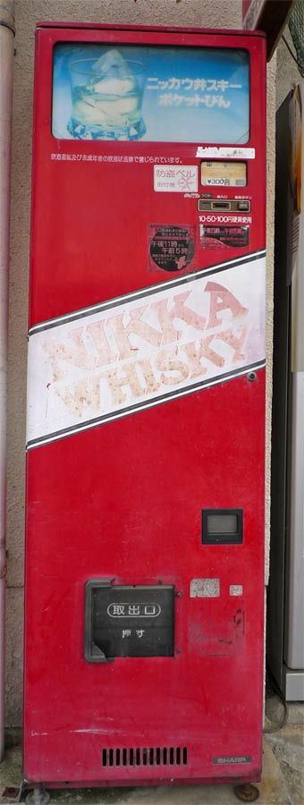 最終的に売られていたのは、サントリーホワイトポケットびんで350円。こちらも500円玉は使えないです。ニッカ、オーシャンとも同型のようなシャープ自販機。
